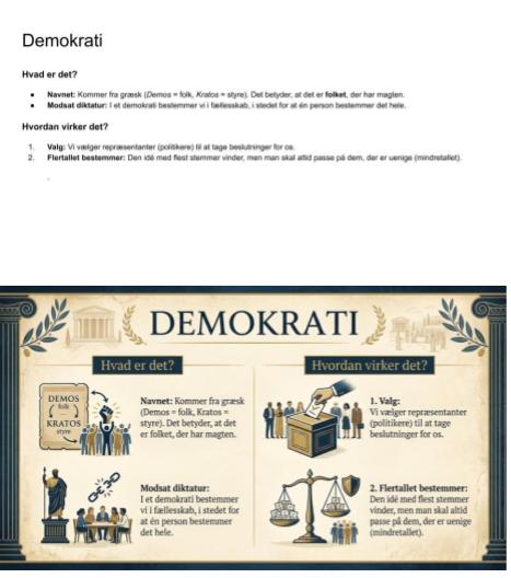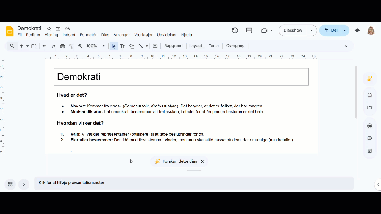 Nano Banana ændrer ikke på teksten på dine slides. Men den tilføjer tema, farver og grafik. Prøv at før og efter-billedet.
