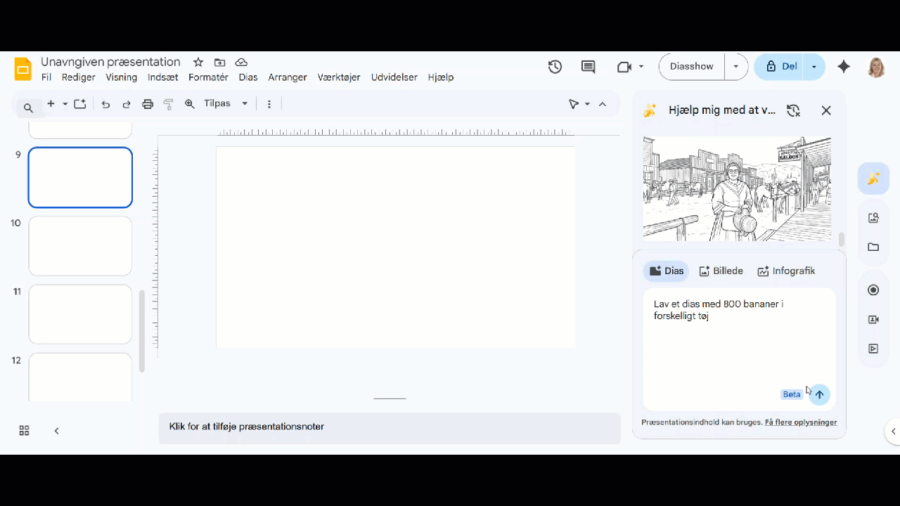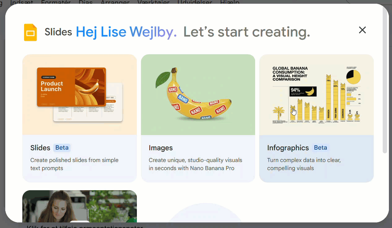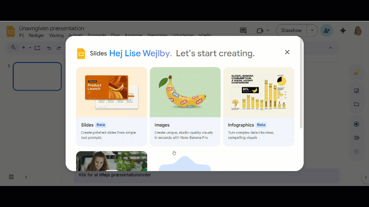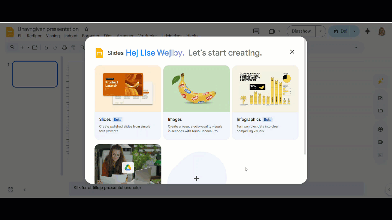 Nano Banana er Googles teknologi, der kan skabe og redigere billeder. Det er kunstig intelligens. Og det rykker i den grad på, hvordan vores slides kommer til at se ud.