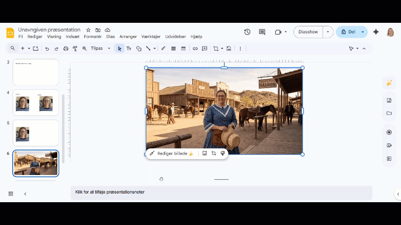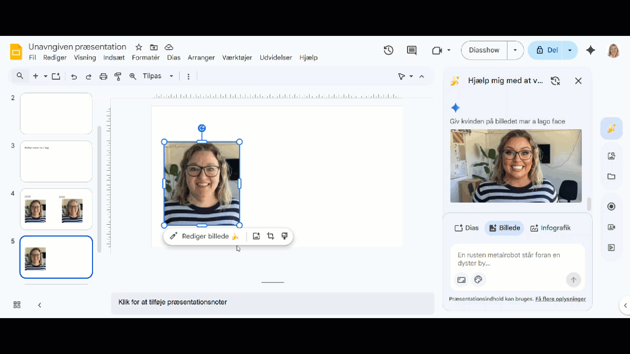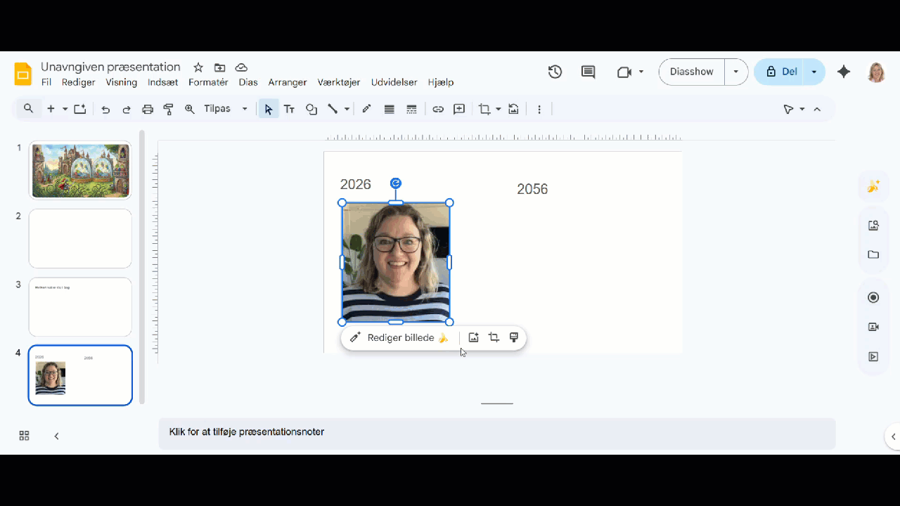 Klik på billedet, klik på bananen ved siden af “Rediger billede” og skriv din prompt – Her har jeg gjort mig selv 30 år ældre. Træk det nye billede ind i slidet.