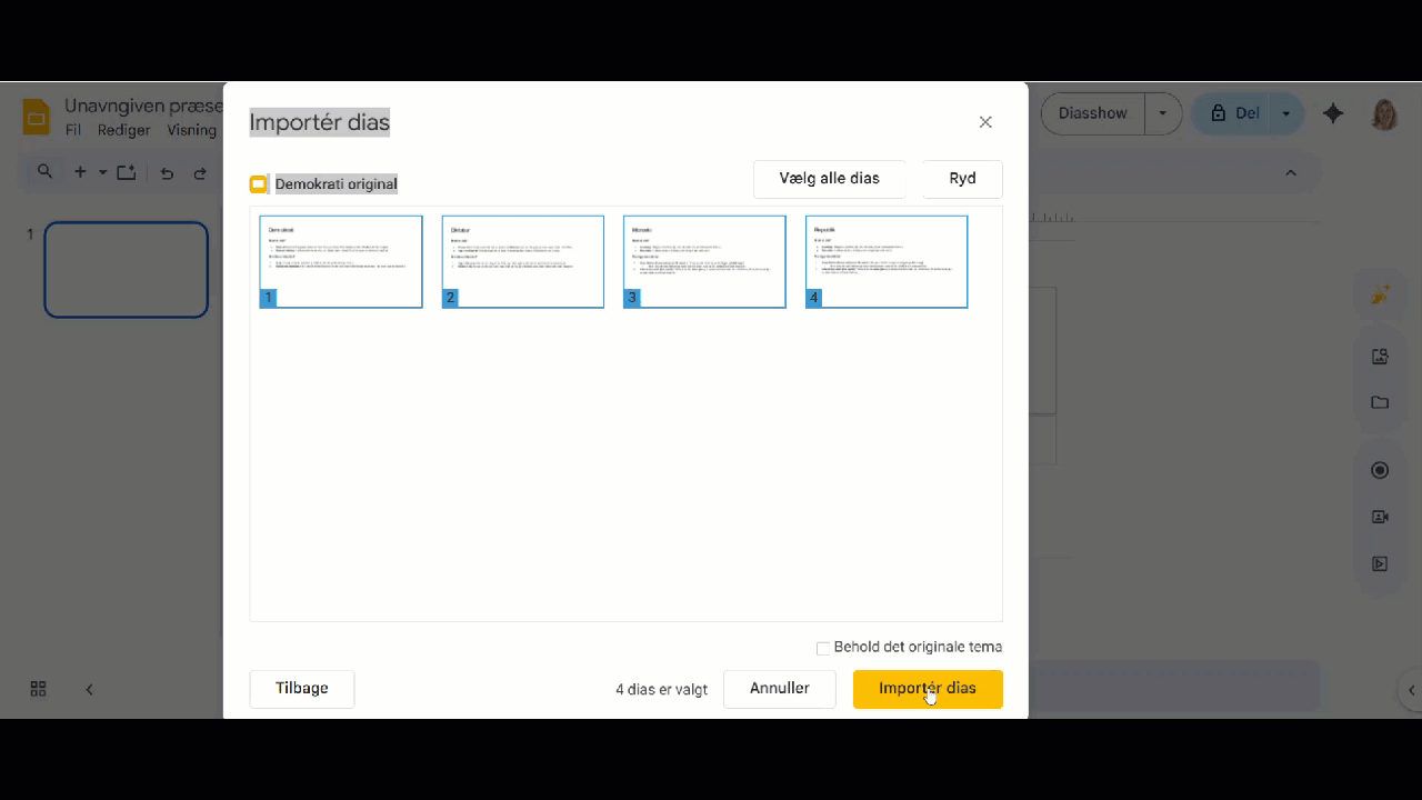 I næste step vælger jeg, at importere alle dias; men man kan også blot udvælge enkelte. Læg mærke til, at første dias er et normalt og tomt titeldias, så det skal slettes, hvis du ikke skal bruge det.