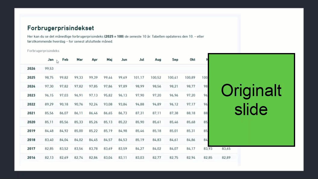 Også her kan Nano Banana noget. Jeg indsatte et forbrugerprisindeks fra Danmarks Statistik i et slide og bad Nano Banana om at oprette infografik.