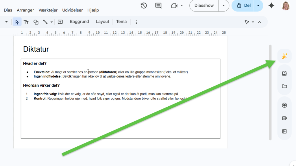 Udover at prompte om antallet af slides, kan man også bede om en anden stil, end den Nano Banana selv sætter ind. Jeg lavede følgende prompt til et slide: “Opret et titeldias om diktatur. Opret herefter 4 andre dias med de øvrigepunkter på slidet. Lav det hele i junglestil.“