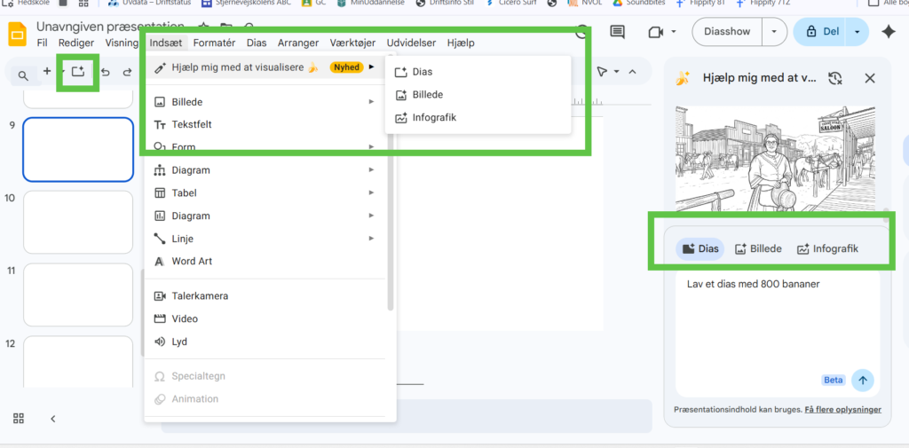 Du kan også let og hurtigt generere billeder direkte i Google slides. Du kan indsætte billeder under “Indsæt” og vælge “Billeder” – eller du kan klikke på bananen i menuen i højre side eller ved knappen “Opret diasbillede” lige under “Redigerknappen.” Der er mange muligheder.