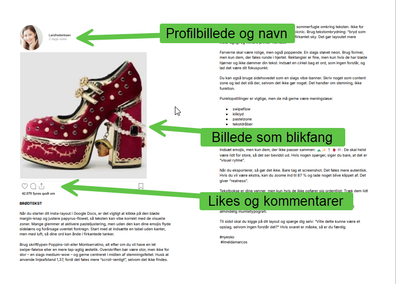 Men det behøver ikke at ligne et specifikt socialt medie overhovedet. Og eleven skal have fokus på indholdet fremfor at bruge tiden på layout.